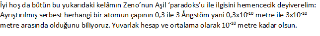 https://blog.metu.edu.tr/caglart/2024/10/13/paradoks-mu-absurd-mu-a/ yazımızda verili excel tablosundan yararlanarak şunu söyleyebiliriz: Henüz yirmi yedinci (27) Zenovari yarılanma aşamasında atom çapı uzunluğuna iniveriyoruz. Tam da orada atomlar, yani kütleli cisimler var; kaplumbağa üstünde veya Aşil’de. Bunlar uzayı büker mi, bükmez mi? “Bükerlerse, daha sonraki Zenovari yarılanmalar ne anlam taşır?” gibi, akla zarar, ziyan ve zeval pek çok soru üstüne bir de şu eklenebilir. “Ne Parmenides ne de Zeno, nereden bilsin ki, atom ne imiş, Einstein kim imiş, Penrose kim imiş, Hawking kimin nesi imiş.”