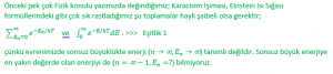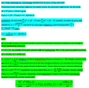 Sadece bu kadarla kalsa şükrederdik belki! Ama, “DALGA MEKANİĞİ – c –“ başlıklı yazımızda değindiğimiz gibi; ν frekans, p doğrusal momentum, λ dalgaboyu ve h Planck sabiti olmak kaydıyla E=hν (Planck Yasası), p=h/λ (Einstein Yasası) ve λ=h/p (de Broglie Yasası) hiçbir sorun içermez. Toplam Enerji eşitliği K+V=E de sorunlu değildir. Ama, Schrödinger Denklemi (K+V)ψ=Eψ sadece serbest olan yani başka bir cisimle etkileşmeyen noktasal parçacık, hayali sonsuz derin potansiyel kuyusu, Hidrojen Atomu ve harmonik salınıcı için tam ve kesin çözüm verir. Karşılıklı etkileşim (‘mutual interaction’) halindeki üç ya da daha çok sayıdaki noktasal (bile olsa) taneciğe ilişkin çözümü yoktur Schrödinger Denklemi’nin. Hoş, Klasik Mekanikte de yoktur. Oysa, bu paragrafın başındaki eşitlikler tam ve kesin olarak evrenseldir.