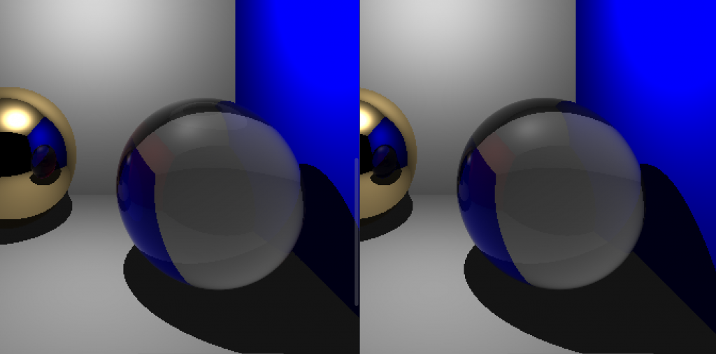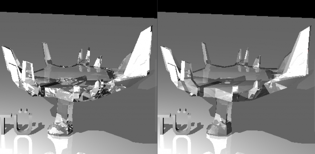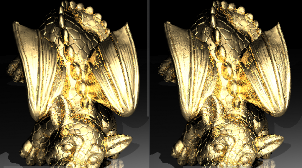 Moreover, with the other dragon scene mine turned out to have a slightly “dirtier” look. (Again, on the right). I could only render this once since it takes too long, therefore I could not test on it. And I believe since easier scenes are not as detailed I was not able to catch the difference. But I was not able to catch any other significant difference in other scenes. (I guess it is the difference between smooth and flat shading)