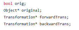 Instance inherits from object, so has its own get normal, check intersection and get object type functions. It also has a pointer to the original object, pointers to forward and backward transformations.