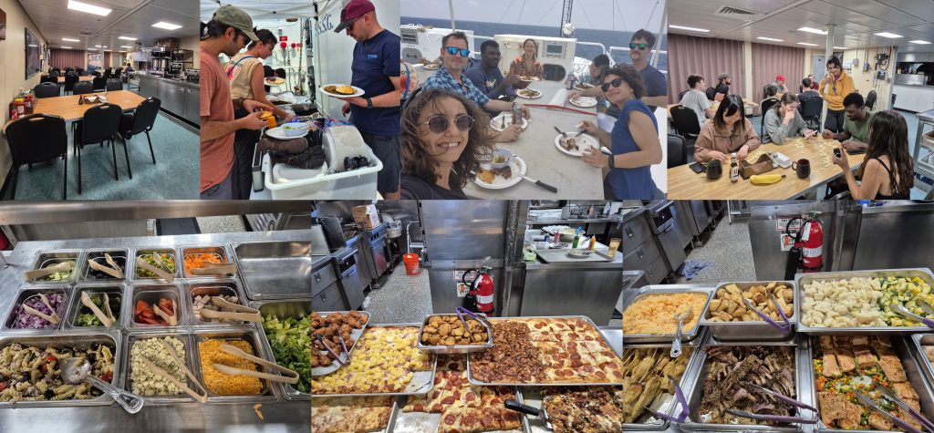 Laboratuvar kurulumundan sonra kendimizi oldukça aç hissediyor ve de müthiş kokuları da takip edip 2. kattaki yemekhanemize çıkıyoruz. Oldukça şanslıyız, menümüz zengin. Salatadan, et ve balık yemeklerine, çeşitli kızartmalara ve de sebze yemeklerine kadar birçok çeşit barındırıyor. Bazı günler tako günü oluyor. Bazı günler ise güvertede mangal yapılıyor. Beni sanırım en mutlu eden pizza ve de peynir günleri oluyor. Bir de her akşam yemeğinden sonra gelen o lezzetli tatlılar… Gemi şartlarında yemekhane insanların en çok sosyalleştiği alanlardan bir tanesi. Aynı zamanda da gemi çalışanları ile kaynaştıkları bir mekan. İnsanların bir yandan yemeklerini yiyip bir yandan da gündelik konuları konuşmaları veya sadece konuşulan konuya dinleyici olmaları bile bu uzun soluklu seferde bir sosyalleşme alanı sağlıyor. Yemekhanenin yemek yenilen bir yer olmasının dışında akşamları insanların oyun oynadığı ve de birlikte vakit geçirdiği bir alana da dönüşüyor. Hele ki bir de atıştırmalık ve de sıcak çay veya kahve varsa!