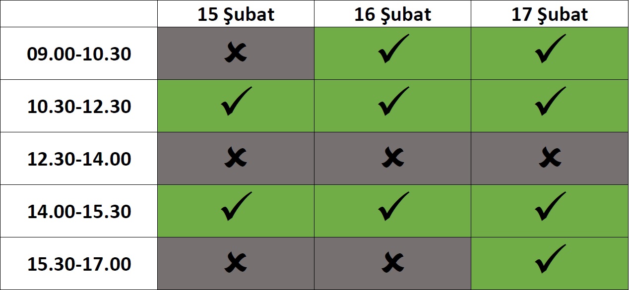 - Ders kayıtları ve danışman onayları 15-16-17 Şubat 2017 tarihlerinde gerçekleşecek. Danışman onayını benden alacaklar için tabloda belirttiğim saatlerde ofiste olacağım: